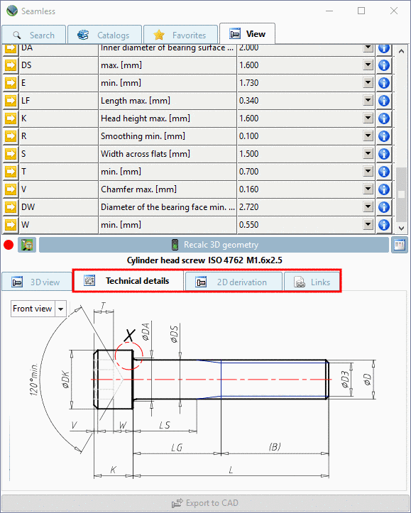 Es werden alle 3 Reiter Technische Angaben, 2D-Ableitung und Verweise rechts neben 3D-Ansicht angezeigt.