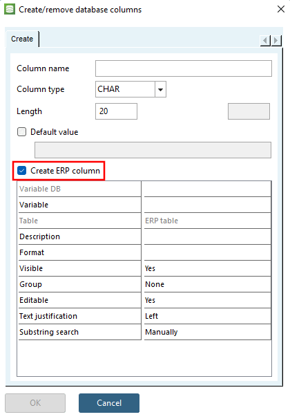 "Tabelle" korrespondiert entweder mit LINKTABLE oder mit ERPTABLE. Neu zugefügte Spalten werden normalerweise in die ERPTABLE eingetragen.