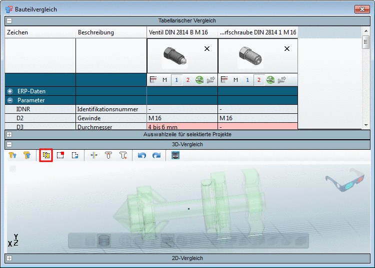 Das gewählte Teil wird zur Steigerung des plastischen Effektes fluchtend dargestellt. Der Hintergrund wird automatisch abgedunkelt. Die Option Rot/Cyan-Effekt ist unabhängig vom Darstellungsmodus (Linien, Verdeckte Kanten, Schattiert, usw.) anwendbar.
