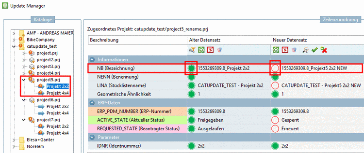 Wenn bei einem Projekt die Normbezeichnung geändert wurde, dann werden im Dialogbereich Katalog alle Projektzeilen, das Projekt selbst und die übergeordneten Verzeichnisse mit dem orangen Ausrufezeichen gekennzeichnet. Das Ausrufezeichen überlagert das jeweilige Grundsymbol (Verzeichnis , Projekt , Zeile ).