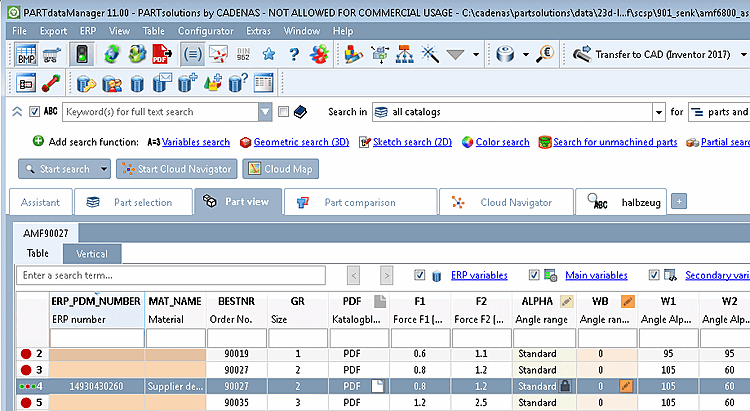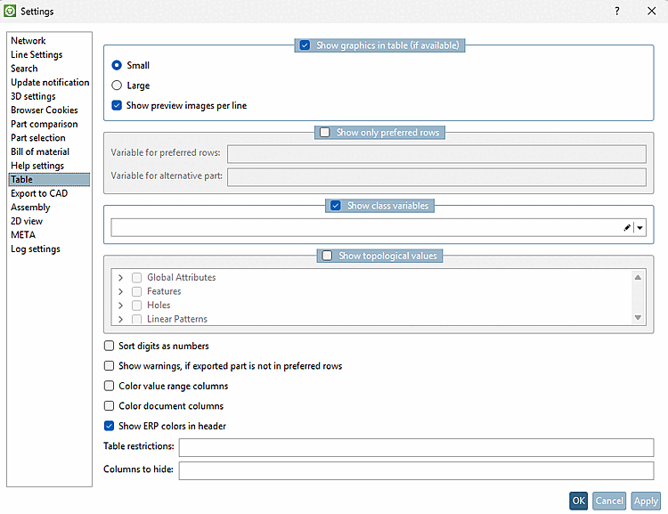 Variable für Alternativteil [Variable for alternative part] : Wenn Sie hier einen Haken setzen, wird das Teil, das in der Tabelle dem Vorzugsreihenteil nächstgelegen ist, als Meta-Datei ans CAD-System übergeben. Diese Funktion wird nur von bestimmten CAD-Systemen unterstützt.