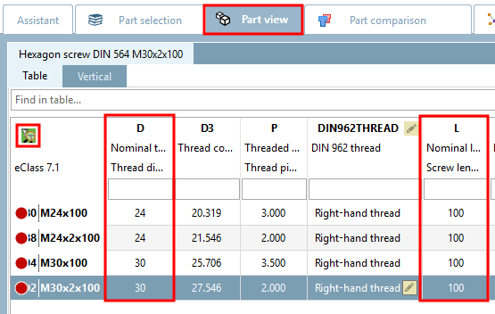 Wenn mit Variablenwerten gefiltert wird, erscheint in der Tabelle der Teileansicht [Part view] links oben ein entsprechendes Icon. Mit Klick auf das Icon wird der Tabellenfilter aufgehoben und Sie sehen alle Zeilen.