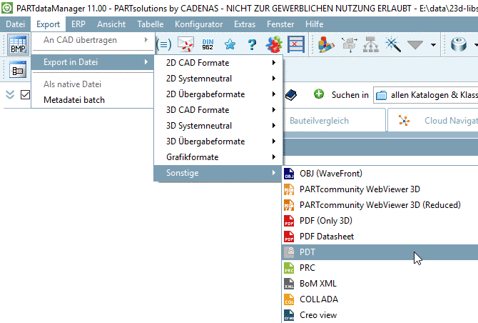 Das Format PDT ist für die strukturierte Weitergabe von Produktinformationen konzipiert. PDT steht für Product Data Template und wurde initial von der CIBSE (Chartered Institution of Building Services Engineers) in GB als Struktur festgelegt. Trägerformat der Informationen sind üblicherweise Excel Dokumente die nach der PDT Struktur aufgebaut sind. CADENAS hat hierzu die Struktur der verfügbaren Templates in einer Klassifikation abgebildet und bietet das Ausgabe- / Trägerformat Excel als Dateiexport an. Voraussetzung hierfür ist ein entsprechend klassifiziertes Katalogteil. Für den Fall, dass ein eCAT Projekt nicht klassifiziert ist, wurde ein MASTER_TEMPLATE definiert, das in der Software enthalten ist. Die übrigen produktspezifischen Templates werden über die Klassifikation gepflegt und vertrieben.