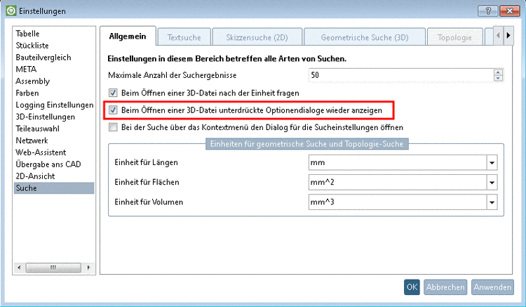 Suche nach: Suchen Sie nach Teilen und Teilefamilien oder nur nach Teilen. (Vgl. Abschnitt 3.1.6.7.1, „Anzeigemodus“).
