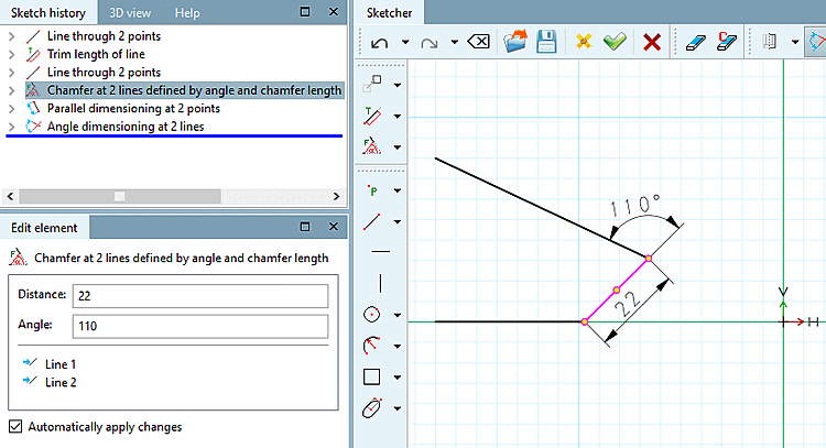 Fase an 2 Linien über Winkel und Fasenlänge [Chamfer at 2 lines defined by angle and chamfer length]