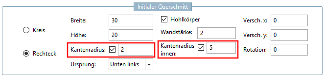 • Breite / Höhe: Bestimmen Sie für die initiale Querschnittsfläche Breite und Höhe.