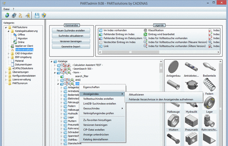 Detaillierte Informationen zu den verschiedenen Indexen finden Sie unter Abschnitt 1.3.8.6, „Kontextmenüs“ in PARTsolutions - Handbuch für Administration.