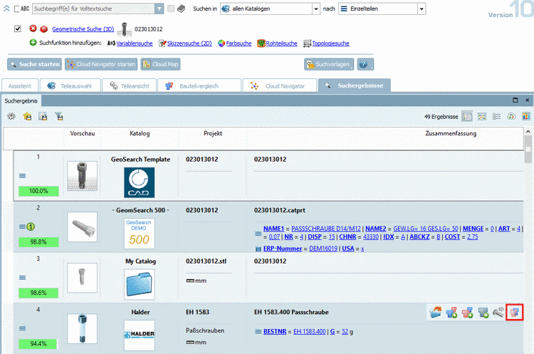 Besonderheit: Bei einer geometrischen Suche wird die Ähnlichkeit zum Referenzteil in Farbe und mit Prozentwerten angezeigt.
