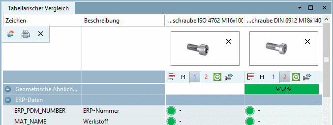 Im Bereich Auswahlzeile für selektierte Projekte sehen Sie die Sachmerkmalstabellen von Suchteil und zu prüfendem Teil. Wählen Sie bei beiden Teilen dieselbe Ausprägung. Detaillierte Hinweise zum Bauteilvergleich finden Sie unter Abschnitt 3.1.6.10, „Bauteilvergleich“.