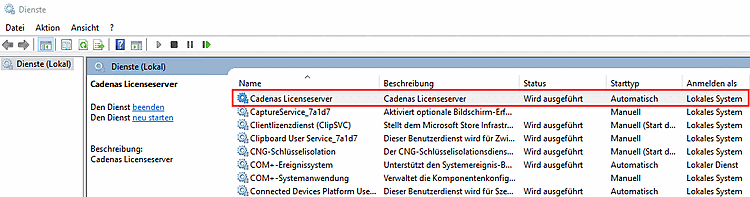 -> Dort sollten Sie nun den Dienst Cadenas Licenseserver vorfinden. In dessen Zeile muss als Status „Wird ausgeführt“ und im Feld Starttyp „Automatisch“ eingestellt sein.