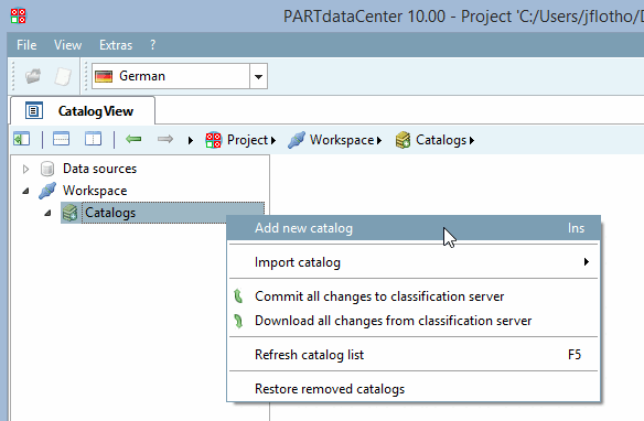 Sie können einen Katalog komplett neu erstellen. Klicken Sie hierzu unter Arbeitsbereich [Workspace] -> Kataloge auf den Kontextmenübefehl Neuen Katalog hinzufügen [Add new catalog].