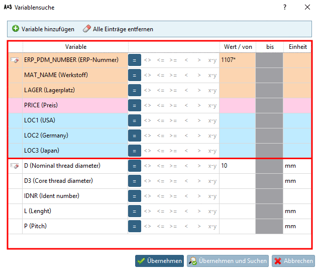 Im Dialogfenster werden grundsätzlich alle ERP-Variablen angezeigt (bei vorhandener ERP-Integration). Mit diesen Variablen können Sie katalogübergreifend suchen.