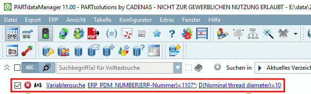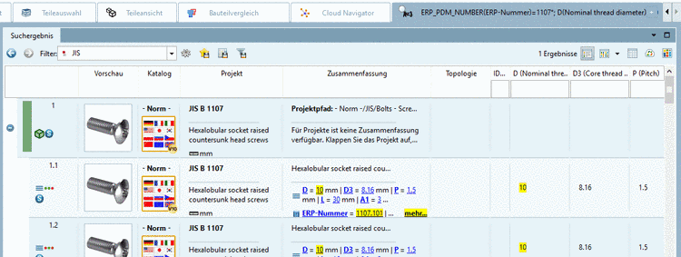 Außerdem werden im Dialogfenster geometrische Variablen angezeigt, welche der aktuell selektierten Verzeichnisebene gemeinsam sind. Die obige Abbildung zeigt beispielhaft die gemeinsamen Variablen von Katalog Norm -> JIS -> Bolts - Screws - Nuts - Washers - Screws -> Screws.