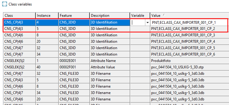Die Merkmale der Klasse CNS_CP|4|3 (Electrical Connection) sind im Dialogfenster Klassenvariablen [Class variables] aufgelistet.