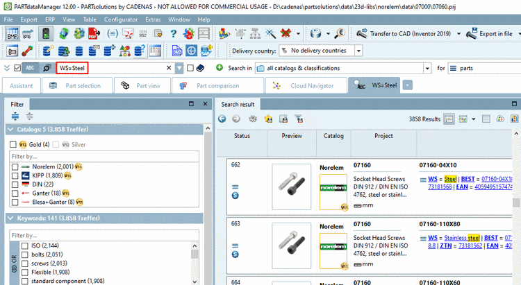 PARTprocure-Daten werden in einem eigenen Dockingfenster angezeigt. Die Informationen werden online von der CADENAS-PARTprocure-Datenbank abgefragt. Die Funktionalität ist gegeben, wenn der Hersteller entsprechende Daten hier ablegt.