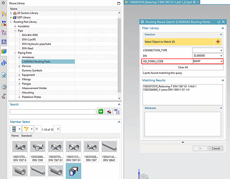 ifugnx.cfgauf ein NX-Merkmal gemappt werden (hier im Beispiel "VDI_FORM_CODE"), einmal unterConnPointCharacteristics(hasConnPointPipingClass)[hier wird der Wert den einzelnen Ports als Charakteristikum zugewiesen] und einmal unterCadPipingAttributes[hier deklarierte Merkmale kommen in der Tabelle an].Damit das Merkmal in der Routing Reuse Search zur Verfügung steht, muss es in