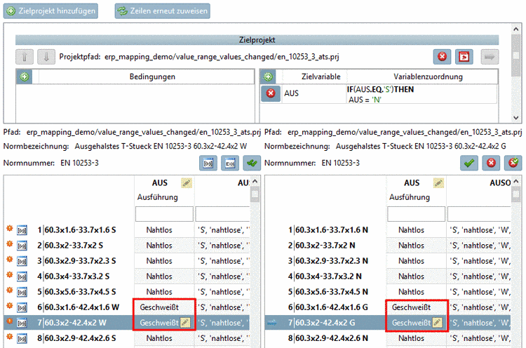 4. Wenn Sie nun links für die Variable Aus Änderungen vornehmen, werden diese sofort automatisch in der rechten Tabelle übernommen.