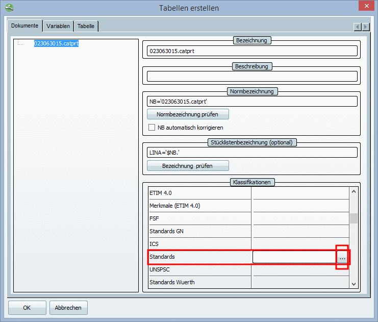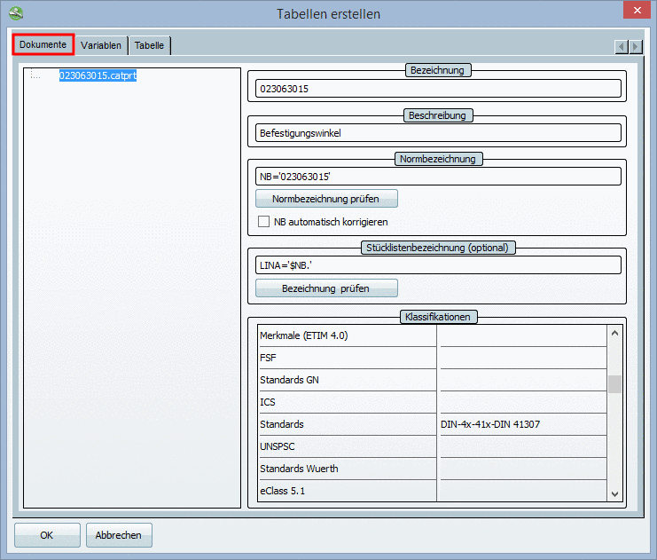 Dialogfenster Tabellen erstellen - Registerseite Dokumente