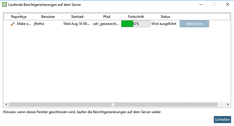 -> Die Erstellung des Reports wird gestartet. Im Dialogfenster Laufende Berichtgenerierungen auf dem Server werden Sie über den Fortschritt informiert.