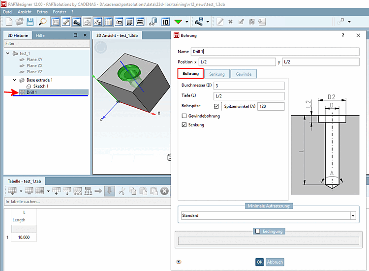 -> Das Dialogfenster Bohrung [Drill] mit den Registerseiten Bohrung [Drill], Senkung [Countersink] und Gewinde [Threads] wird geöffnet.