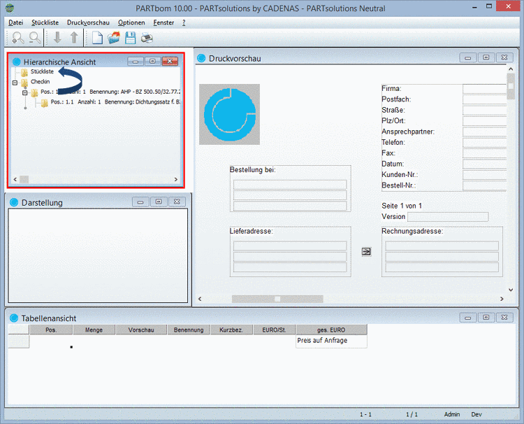 4. -> PARTbom wird geöffnet und zeigt das übergebene Teil als Unterverzeichnis des Ordners Checkin im Menübereich Hierarchische Ansicht.