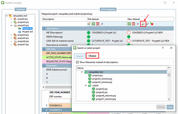 Sie können die fehlende Zuordnung nun im Dialogbereich Zeilenzuordnung [Line mapping] in der Spalte Neuer Datensatz [New dataset] mittels Klick auf den grünen Haken