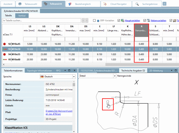 Technische Angaben werden auch in der Teileauswahl und unter Suchergebnisse im Tooltip angezeigt. Vergleiche Abb. „Beispiel: 3D Tooltip + Technische Angaben im Modus Symbole“ oder Abb. „Modus "Tabelle"“. | |