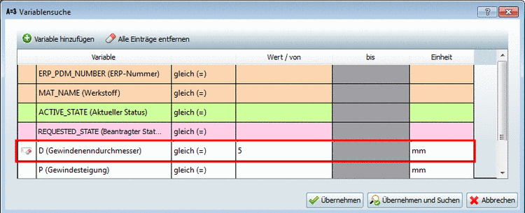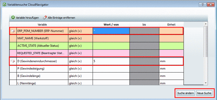 Fügen Sie in der Zeile ERP_PDM_NUMBER als Wert das Platzhaltersymbol '*' hinzu. D.h., beim nächsten Suchlauf müssen die Ergebnisteile zusätzlich eine ERP-Nummer aufweisen.