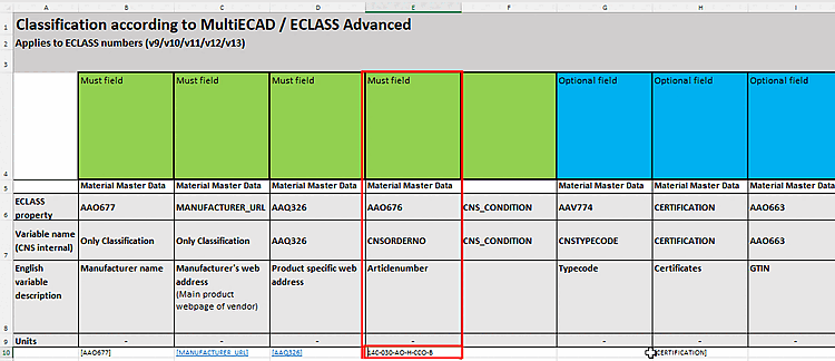 In der Excel-Datei, im entsprechenden produktspezifischen Datenblatt (in der Abb. unten beispielhaft "motors"), unter REFERENCE_FEATURE_GROUP_ID (Spalte B) muss die entsprechende Klasse, nach der klassifiziert werden soll, eingetragen sein. Folgende Abb. zeigt hier "27023003".