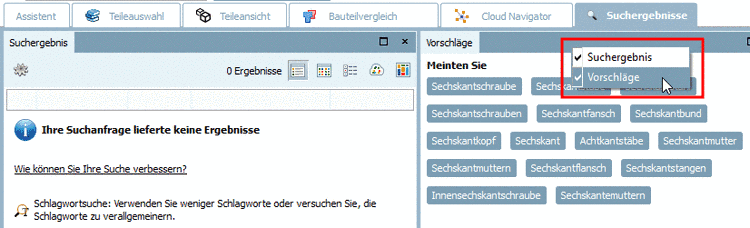 Bei einem Tippfehler wie z.B. "Sechskantschrube" erhalten Sie als ersten Vorschlag den korrekten Begriff "Sechskantschraube".