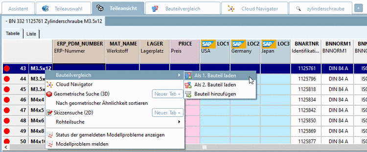 Bauteil laden aus Teileansicht -> 3D-Ansicht per Kontextmenübefehl