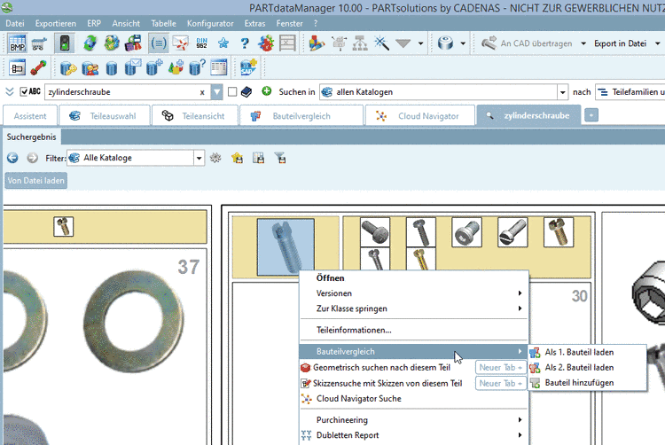 Sie können Bauteile per Kontextmenübefehl in den Bauteilvergleich übernehmen.