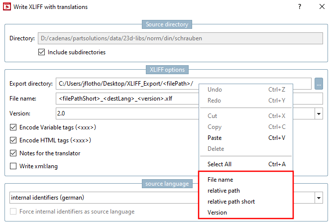 .xlf.Im folgenden Beispiel wurde bei Export-Verzeichnis [Export directory] der Platzhalter "<filePath>" angehängt. -> Im Export-Verzeichnis werden dann die entsprechenden Unterordner automatisch erzeugt.