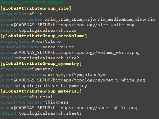 Die aufgelisteten Features und globalen Attributgruppen (globalAttributeGroups) in den Kategorien werden in der Config in weiteren Blöcken genauer definiert (z.B. [feature_Cylinder] oder [globalAttributeGroup_symmetry]). Einer Kategorie können sowohl globale Attributgruppen als auch Features hinzugefügt werden.