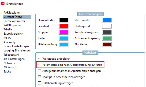 Möchten Sie das alte V11-Verhalten wieder herstellen, können Sie dies im PARTdesigner unter Extras-Menü -> Einstellungen... -> Sketcher (hist.) -> Verhalten tun, indem Sie die Option Parameterdialog nach Objekterstellung aufrufen aktivieren.