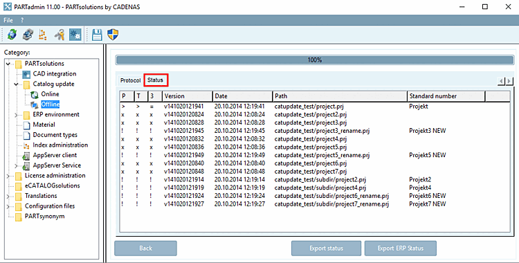 Unter PARTadmin -> Kategorie "Katalogaktualisierung [Catalog update]" -> "Offline" -> "Prüfen [Check]" -> Registerseite "Status" erhalten Sie eine Liste aller Projekte.