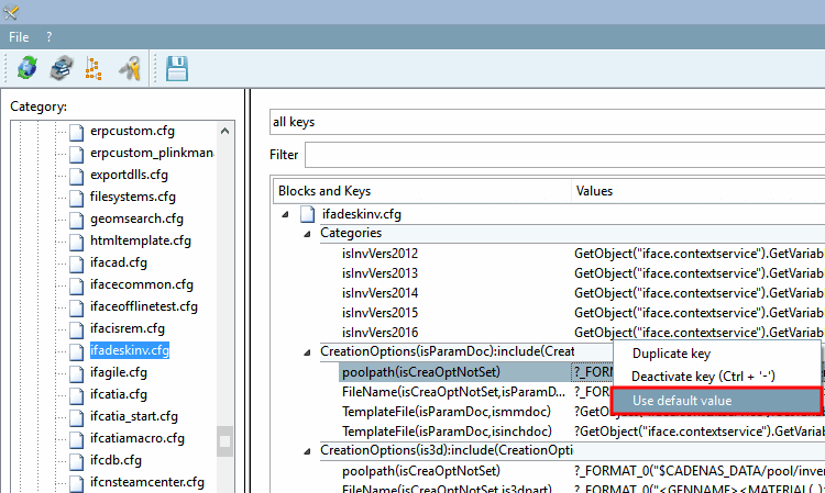 Bei aktiviertem $CADENAS_SITESETUP finden Sie noch den zusätzlichen Kontextmenübefehl Defaultwert wiederherstellen [Restore default value] über Werten. Nähere Informationen zum SITESETUP finden Sie unter Abschnitt 1.7.6, „$CADENAS_SITESETUP “.