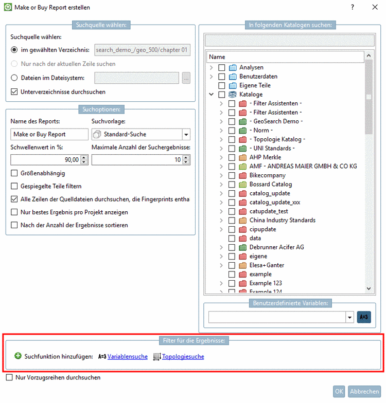 Mittels Dialogbereich Filter für die Ergebnisse können Ergebnisse weiter eingeschränkt werden. Verfügbare Filter sind Variablensuche und Topologiesuche. Die Funktionen können mit Klick auf Suchfunktion hinzufügen auch mehrmals verwenden.