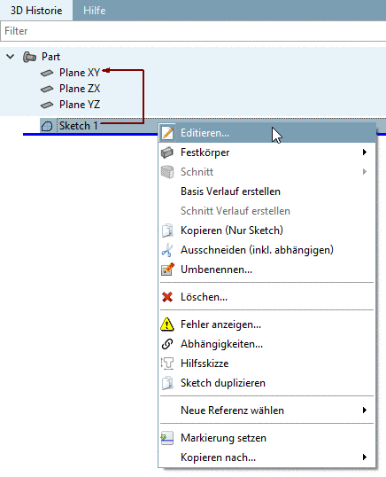 1. Öffnen Sie im Dockingbereich 3D Historie auf einer der drei Ebenen (Plane XY, ZX. YZ) das Kontextmenü.