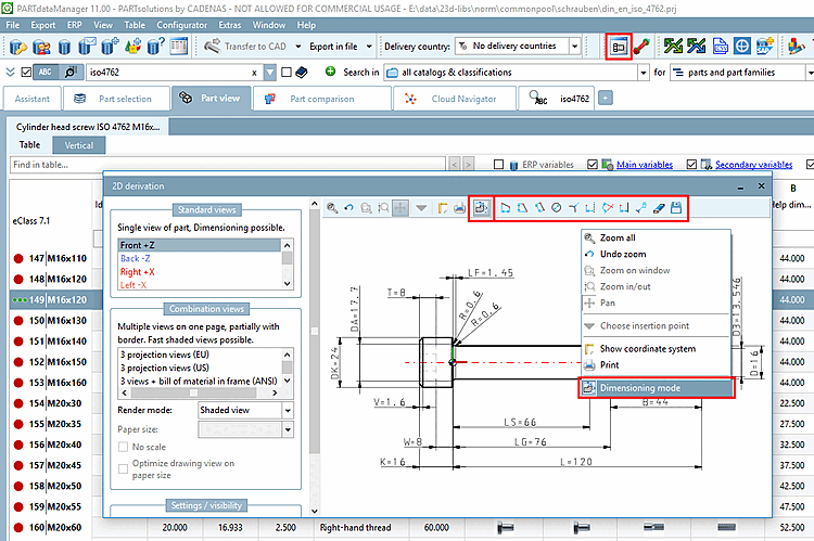 Via PARTdataManager -> Schaltfläche 2D-Ableitung [2D derivation] -> Dockingfenster 2D-Ableitung [2D derivation] -> Kontextmenübefehl Bemaßungsmodus [Dimensioning mode] oder alternativ per Icon Bemaßungsmodus [Dimensioning mode]