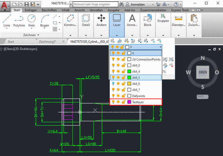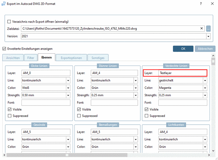 4. Hier im Beispiel wird der Layername unter Verdeckte Linien auf "Testlayer" gesetzt.