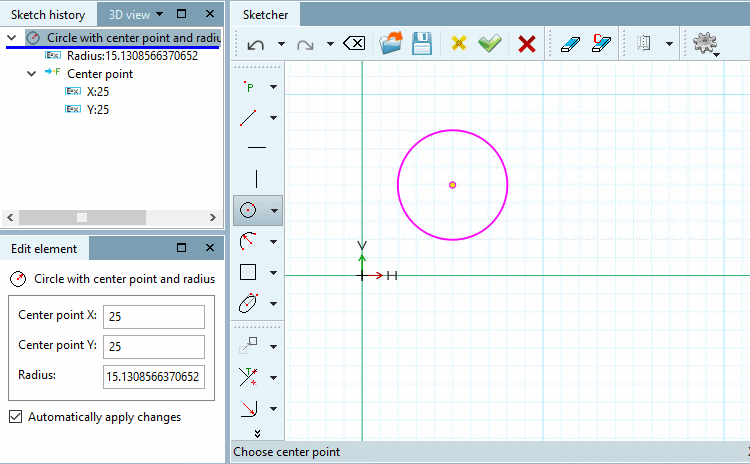 Wenn nötig, passen Sie die Werte der Punkte von Mittelpunkt X, Mittelpunkt Y und Radius im Dockingfenster Element editieren [Edit element] an.