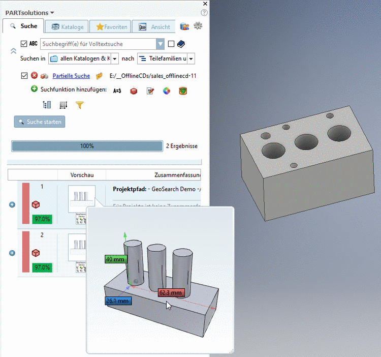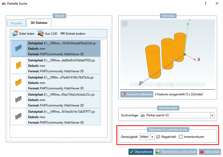 Bei manchen CAD-Systemen kann die Feature-Auswahl direkt im geöffneten Bauteil erfolgen. Sofern diese Möglichkeit besteht, finden Sie im PARTsolutions-Menü den Befehl Partielle Suche durchführen. Ansonsten steht die Funktionalität über Seamless oder PARTdataManager zur Verfügung (siehe unten).