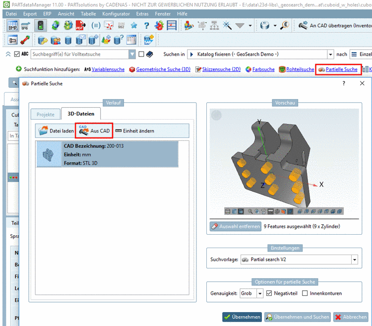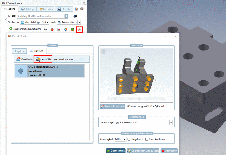 Alternativ (auch wenn der Befehl Partielle Suche durchführen nicht zur Verfügung steht) können Sie ein Teil auch über Seamless öffnen. Im Dialogfenster finden Sie den Befehl Aus CAD.