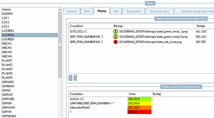 Hier bei Benutzer "location", Rolle "LOC2" liegt der Fall anders. Es besteht ein Eintrag auf der Registerseite Anzeige [Display] unter Statusfarben für Katalogindex [Status colors for catalog index]. Dies bedeutet, dass die Farben der hier eingetragenen Bedingung folgen, somit die Grün/Halbtransparent-Farbgebung außer Kraft gesetzt wird.