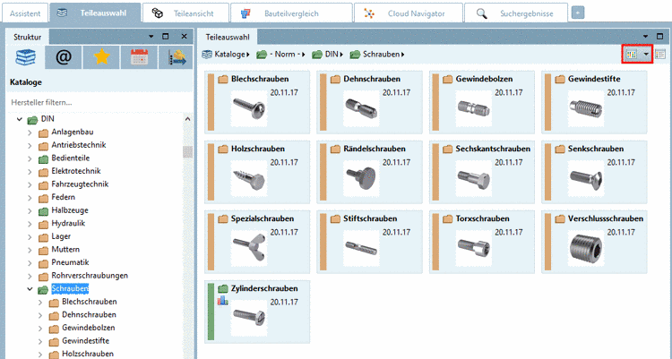 Rechts in der Teileauswahl werden nun die Elemente der nächst tiefer gelegenen Ebene angezeigt.