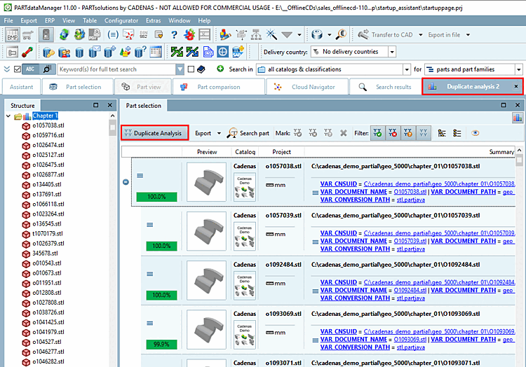 Eine Dublettenanalyse kann auch nur für eine bestimmte Gruppe von Teilen ausgeführt werden. Verwenden Sie hierzu den Quellteile-Filter [Source part filter].
