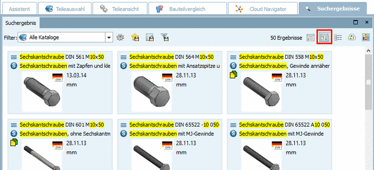 Alle Ergebnisse werden aufgelistet und sind mit dem Einzelteile-Symbol