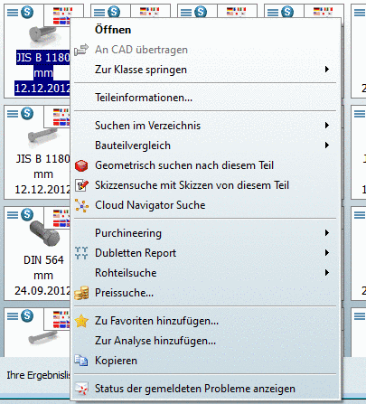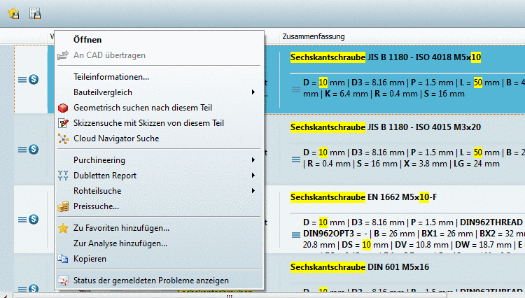 Wenn Sie die Maus über eine Zeile bewegen, werden entsprechende Schaltflächen eingeblendet, über die Sie die Teileansicht oder den Bauteilvergleich erreichen oder das betreffende Bauteil direkt ins CAD-System exportieren können.