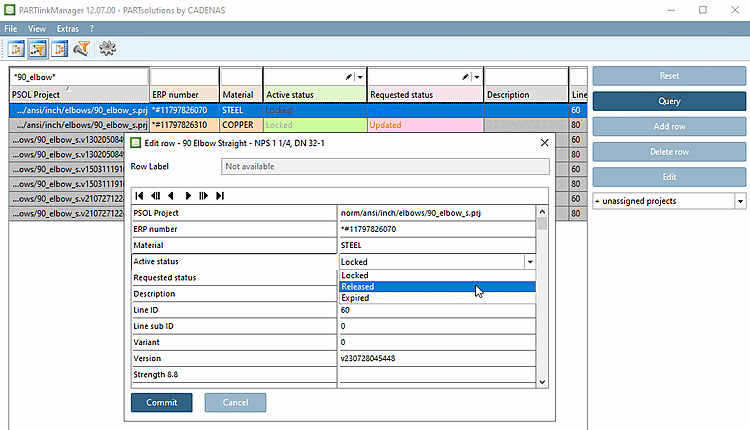 Im PARTlinkManager können Sie alle Felder eines Datensatzes (ERPTABLE und einige Felder der LINKTABLE (Aktueller Status [Active status], Beantragter Status [Requested status])) editieren.[13]